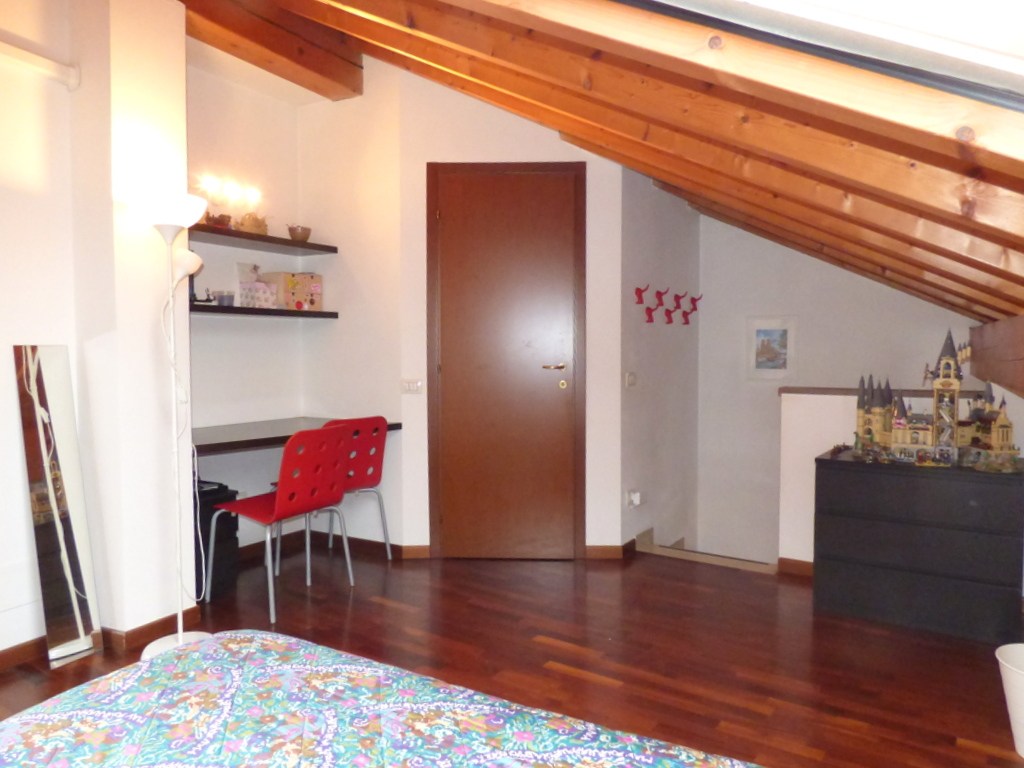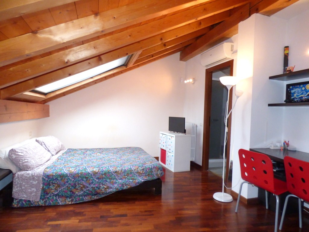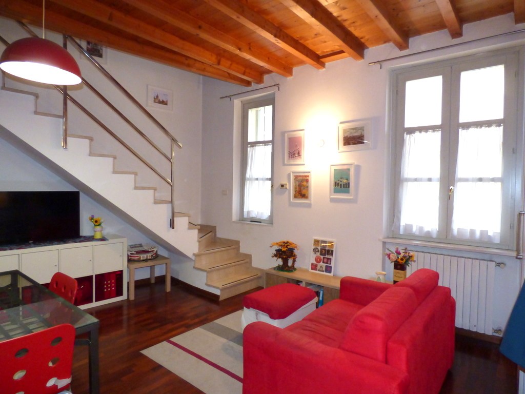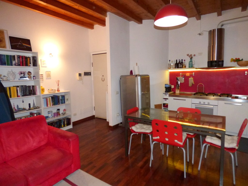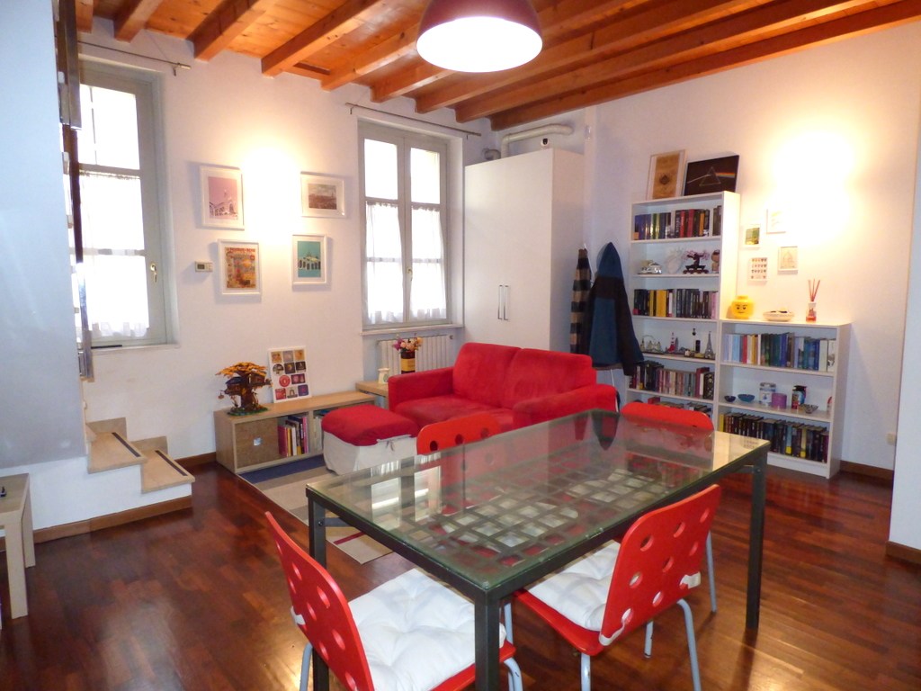 Zona Centro, in corte signorile di recente costruzione, particolare appartamento disposto su due livelli, arredato e dotato di impianto di aria condizionata, composto da soggiorno con cucina a vista, scala comoda che accede al piano mansardato con camera, cabina armadio e bagno.Completa la proprietà la cantina con la possibilità di acquistare a parte il box ad Euro 22.000,00. Libero a luglio 2026.